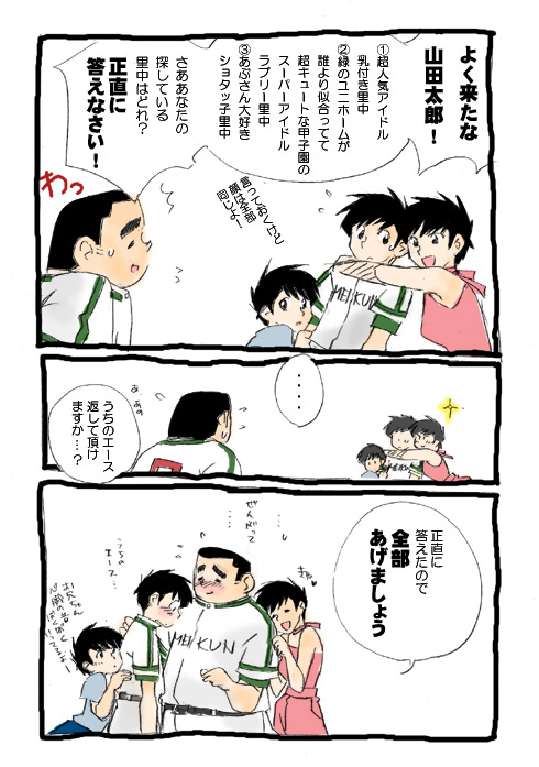 ちなみにそこそこ乙女向けなのでお気を付け下さい。山里メインの球里・三里てところでしょうか。ロッテの三馬鹿大好きです。里中受はたいがい大好物です。