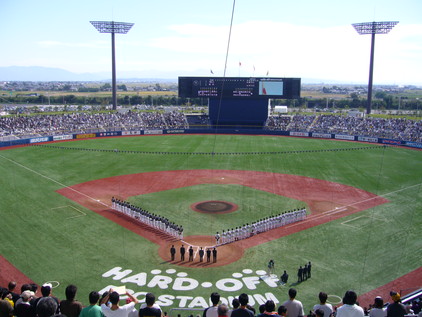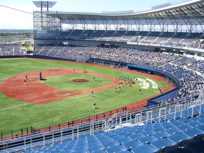 外野席の向こうににはのんびりとした田んぼと青々とした山並みが。マリンスタジアムに慣れた身には新鮮でした。所沢なんか目じゃないぜ。いろんな意味で。