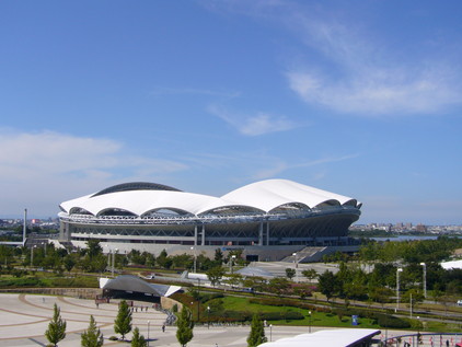 すぐ裏にはビッグスワンスタジアム。新潟アルビレックスの本拠地。なんか芸術的な形状をしていました…